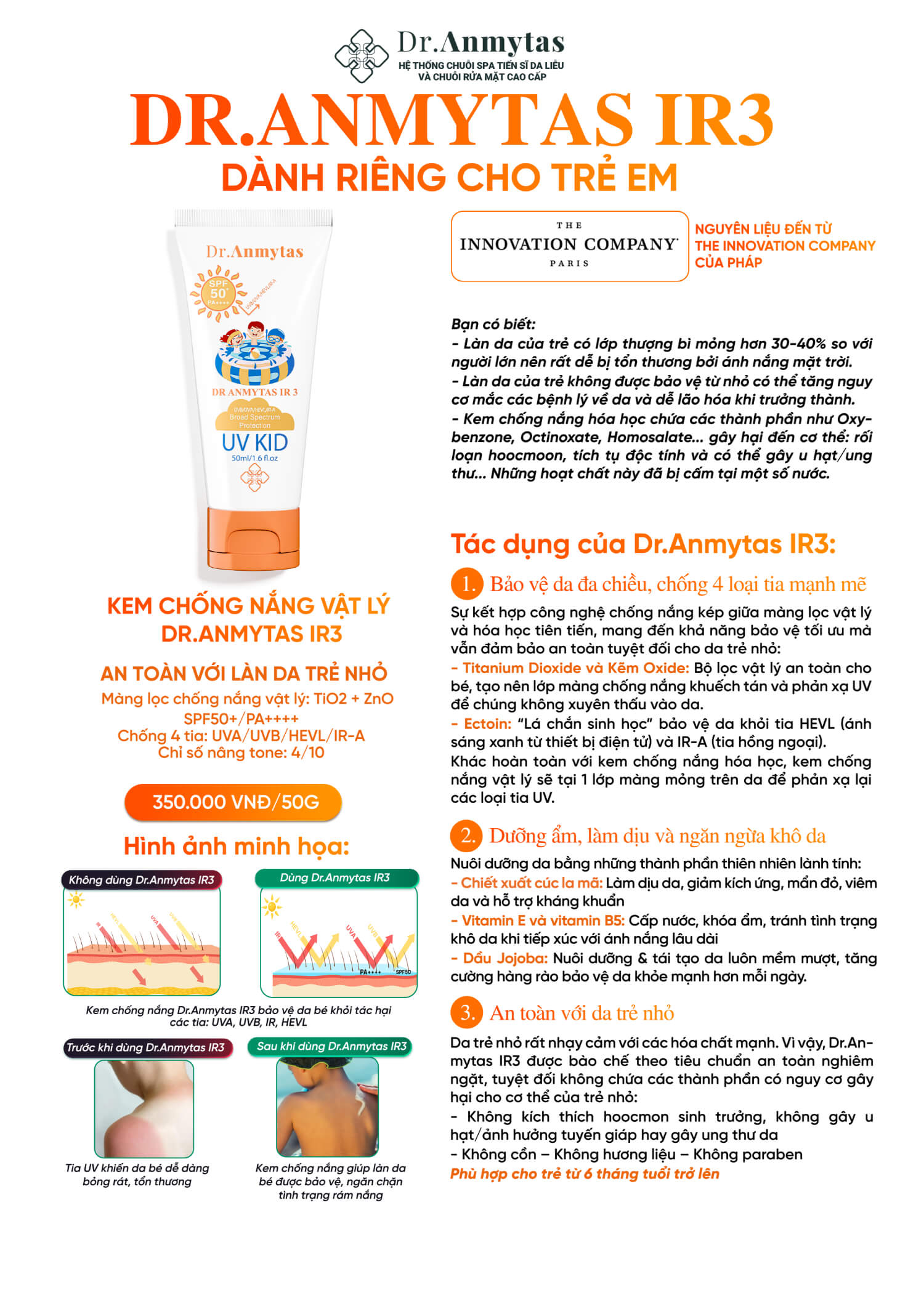 Dịu nhẹ and an toàn như vòng tay of mẹ, DR.ANMYTAS IR3 bảo vệ da bé tối đa khỏi tia UVA, UVB, IR, HEVL bằng công thức chống nắng vật lý an toàn, không chất hóa học gây độc hại đến cơ thể bé yêu