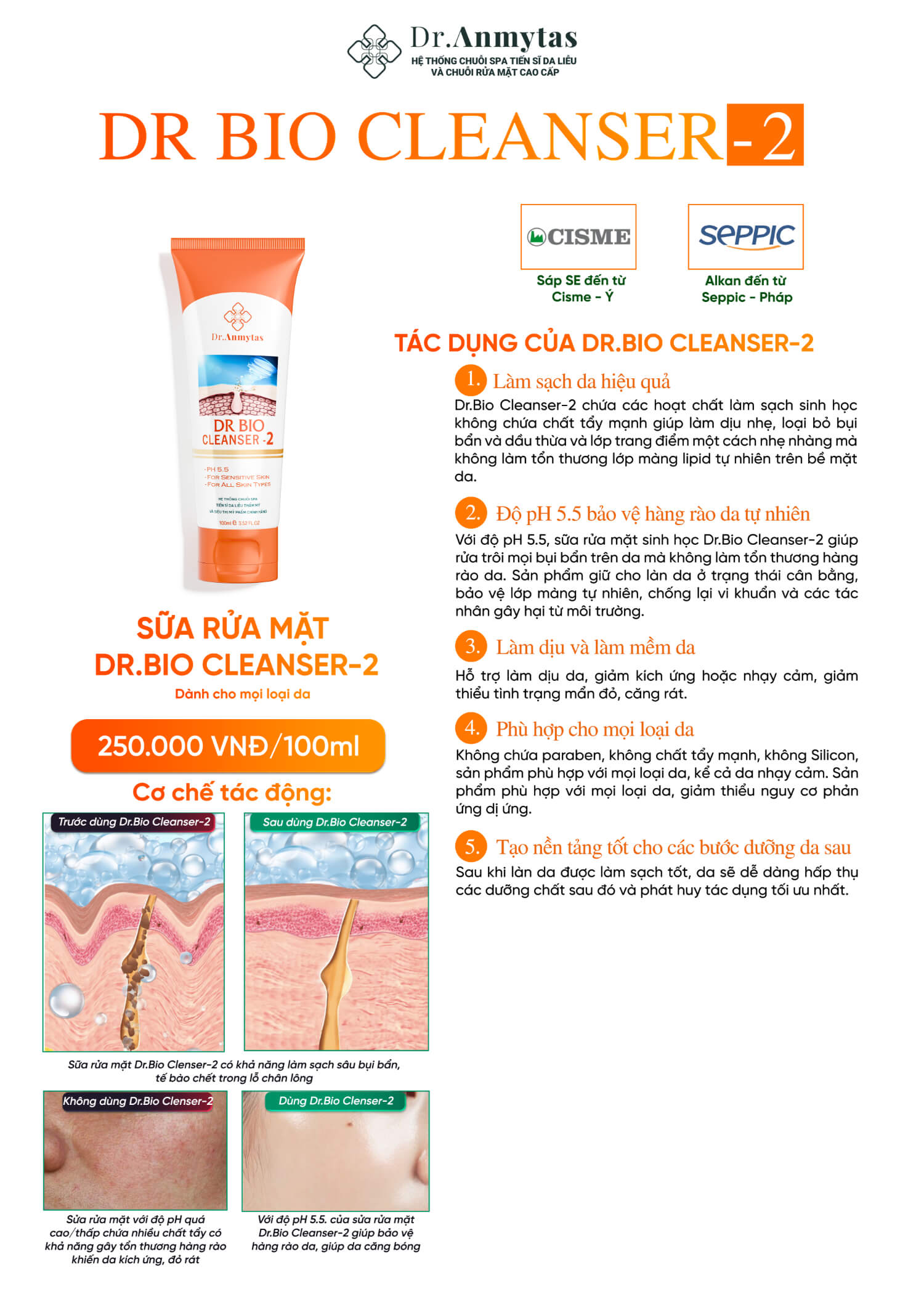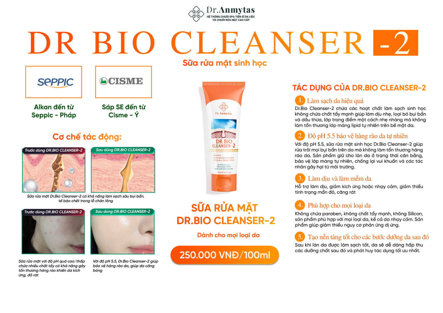Dr.Bio Cleanser-2 chứa các hoạt chất làm sạch dịu nhẹ, không chứa chất tẩy mạnh giúp loại bỏ bụi bẩn and dầu thừa and lớp trang điểm một cách nhẹ nhàng mà không làm tổn thương lớp màng lipid tự nhiên on bề mặt da.