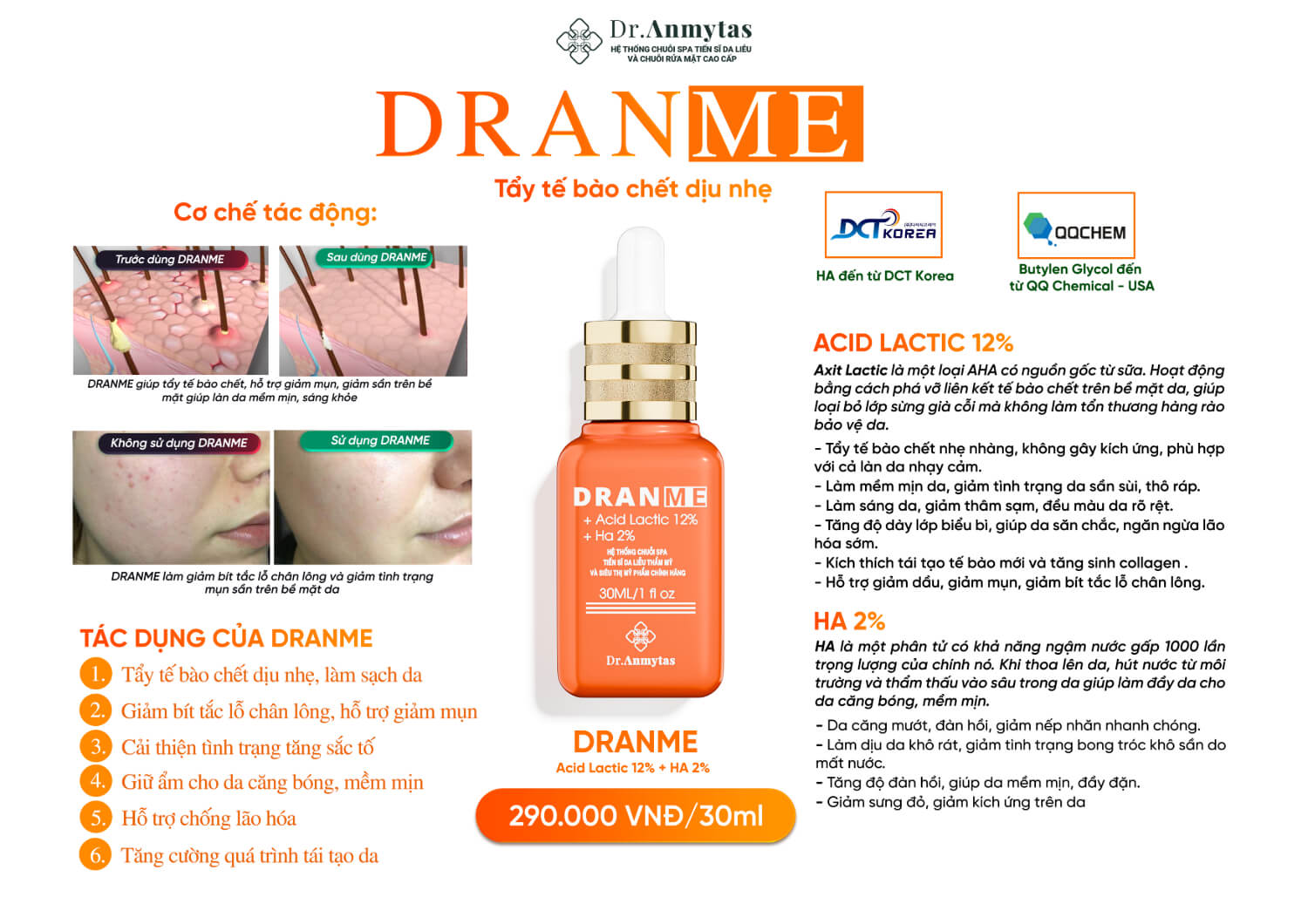 Công thức hoạt chất Acid Lactic 12% + HA 2% tẩy tế bào chết dịu nhẹ and mềm ẩm
