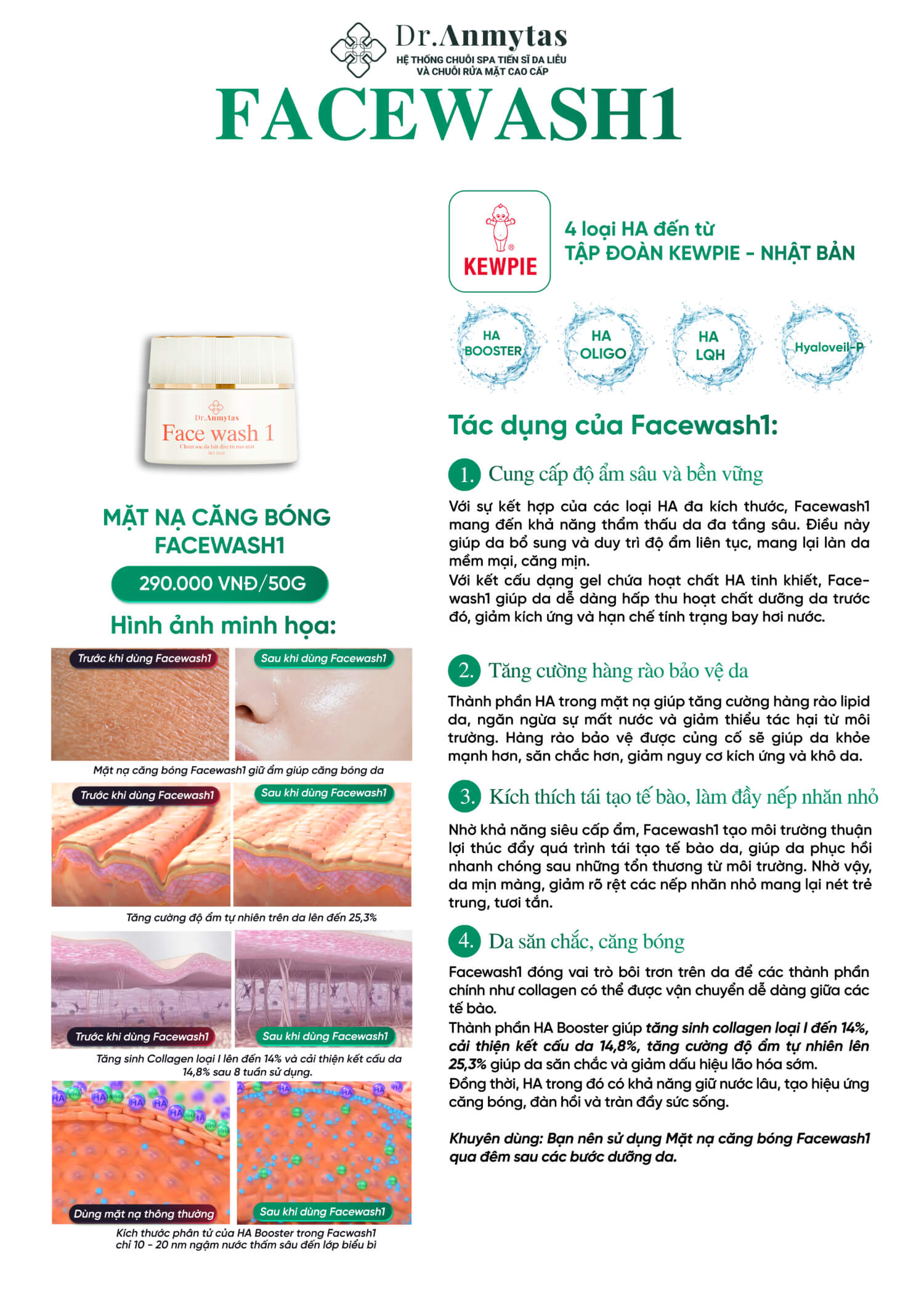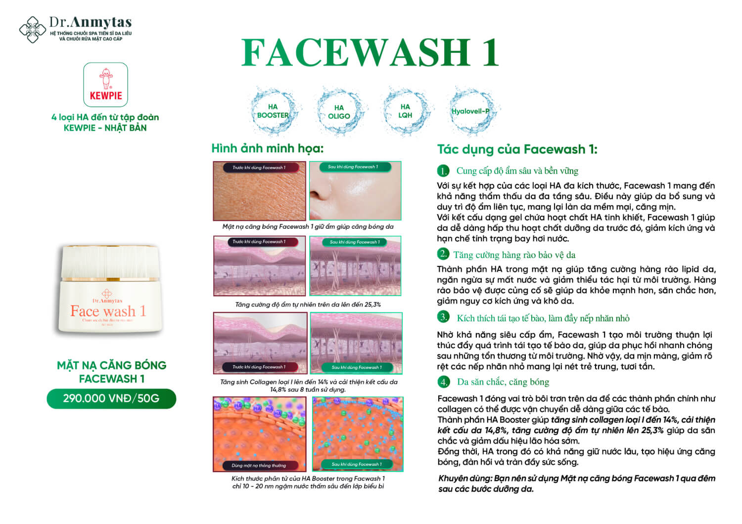Facewash1 đóng vai trò bôi trơn on da để các thành phần chính như collagen có thể được vận chuyển dễ dàng giữa các tế bào.